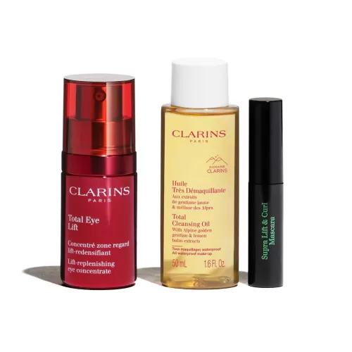 Dieses Set Enthält Drei Expertenformeln. Total Eye Lift, Die Lifting-Pflege Für Die Augen Mit Hautdichte Förderndem Biologischen Haronga-Extrakt Und Glättendem Cassia-Wachs, Die Den Augen In 60 Sekunden* Einen Lifting-Effekt Verleiht Und Die Hautdichte Fördert. Mascara Supra Lift &Amp; Curl Verleht Den Wimpern Schwung Und Huile Très Démaquillante, Entfernt Unreinheiten Und Sorgt Für Eine Weiche Und Reine Haut. Eine Große Kosmetiktasche Enthält Alle Diese Pflegeprodukte. *Für 80% Der Frauen – Verbrauchertest – 110 Frauen, Zustimmung In %